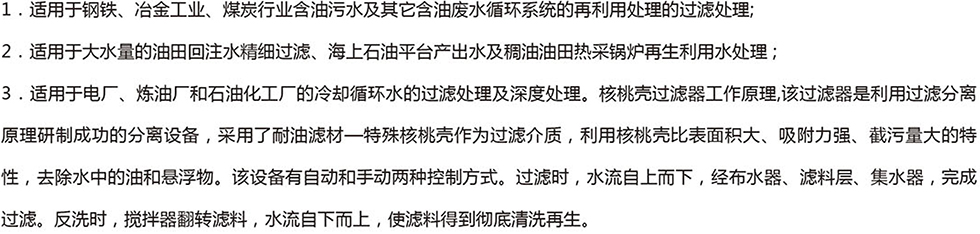 核桃殼過濾器正是利用上述原理及經(jīng)過特殊處理的野生核桃殼的多孔和大表面積,將污水中懸浮物和油珠攔截在濾料層表面或吸附在濾料表面,運行一段時間后也即濾料飽和出水水質(zhì)惡化時,停止進(jìn)水進(jìn)行反洗,使濾料恢復(fù)原有特性,而反洗水將截留物帶走,實現(xiàn)過濾油和機(jī)械雜質(zhì)的效果。